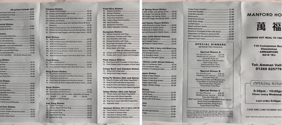Welcome to Manford House, your go-to Chinese takeaway and restaurant in Glanaman, Ammanford. Indulge in a delightful menu featuring favorites like house special fried rice, Hong Kong style chicken balls, and crispy spring rolls, all served in a casual atmosphere perfect for a quick bite or a leisurely dine-in experience. With wheelchair-accessible facilities and convenient late-night food options, we cater to all. Enjoy hassle-free dining with our table service and accept various payment methods, including credit and debit cards. Reserve your table today and discover why we’re a beloved choice for delicious Chinese cuisine!Customers rave about the BBQ spare ribs, praising the perfect balance of tenderness and flavor. Many meals, especially the house special fried rice and Hong Kong-style chicken balls, disappear from plates in record time, thanks to their irresistible taste. The generous portions paired with reasonable pricing often surprise diners, who frequently note how little they pay for such quality food. The friendly staff are also a highlight, making every visit warm and welcoming. Let’s not forget the memorable late-night food option that satisfies cravings at odd hours. Overall, it feels like a beloved local spot eager to serve its community.